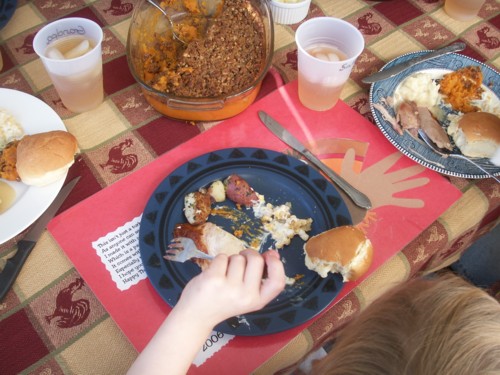 Sarah brought the placemat she made in school. The turkey's wings' patterns were traced around her hands.