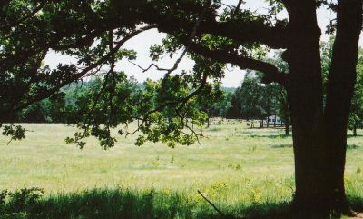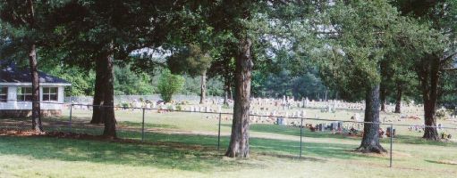This is a view of Old Liberty Cemetery from the west side of the building looking southeast. Decoration Day is something like a community reunion. Family and friends gather for a time of meditation in the cemetery and then assemble for a religious service in the building. A 'Dinner on the Grounds' is shared under the shade of these trees at noon following the program. There usually is an afternoon program of singing. |