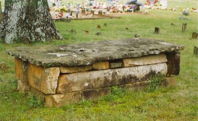 This tomb of natural stone is not at Old Liberty, but at Lost Corner Cemetery. There once were several like this at Old Liberty, but the descendents of the ones buried in them removed the stones some years ago. The stones are for decoration only and do not serve a practical function in protecting the grave. When we were children, we would try to peek inside these tombs. I remember that I once saw that the grave had caved in inside the stone enclosure. |