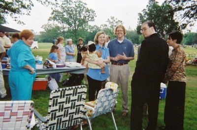We moved outside and the communal meal was laid out on tables and everyone shared this 'Dinner-on-the-Grounds.' Those in the foreground are my sister on the left; her daughter-in-law holding the little girl; her son; and one of our nephews and his girlfriend. The little girl is my sisters granddaughter. In the background at the end of the table are my stepdad's youngest sister in light blue, whose husband had just died; my youngest sister, Sherrye, who is the mother of the nephew in black; the widow's daughter (her head is just visible); and two granddaughters (the girls in white and blue). |