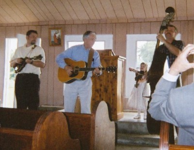 On Mother's Day, we all returned to the cemetery for the Decoration Day program. The program usually has a welcome, group singing, special music, a sermon, and prayer, of course. A short business meeting might be held before lunch, but usually follows lunch. This is one of the groups that played and sang. The man with the guitar is the husband of the step cousin that was my age. She and I were close friends when we were children and are still close. Their two sons are playing the banjo and bass. Their only grandchild is playing along on the violin. This and the next photo were taken with a disposable camera left over from John's wedding. The images are a little soft. |