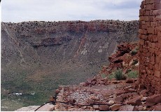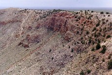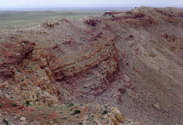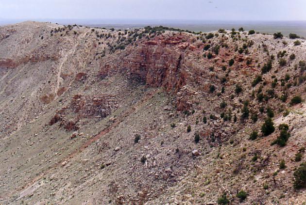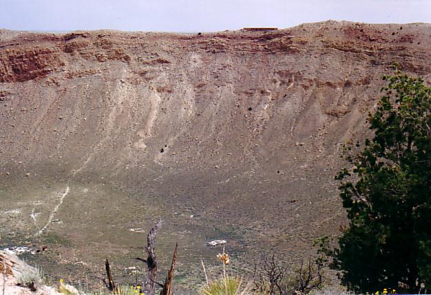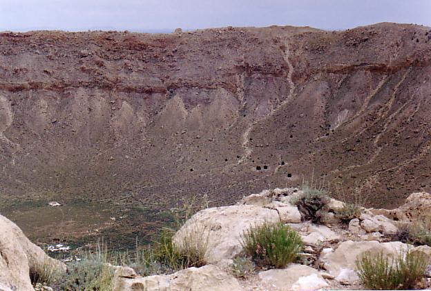 The Great Meteor Crater of Arizona is just south of Interstate 40 between Flagstaff and Winslow. It is visible from the highway. It was created by the impact of a large meteorite about 50,000 years ago. It is about 4, 150 feet across and 570 feet deep. The early explorers and settlers assumed that it was an old eroded volcanic crater. It was many years before the general public accepted the view that it had been created by meteor impact. Some assumed that the meteor was a large chunk of iron and that the remaining iron could be mined at a profit. Early drilling was done in the center of the crater because it was assumed that the meteor had to be traveling straight down to create a circular crater. Studies eventually showed that low angle impacts also cause circular craters and that the meteor that caused this crater was coming from the north, northwest. Mining efforts shifted to the south rim, but nothing was found there either.