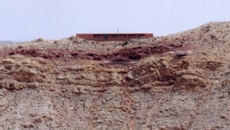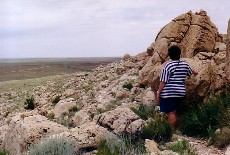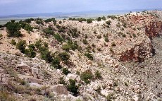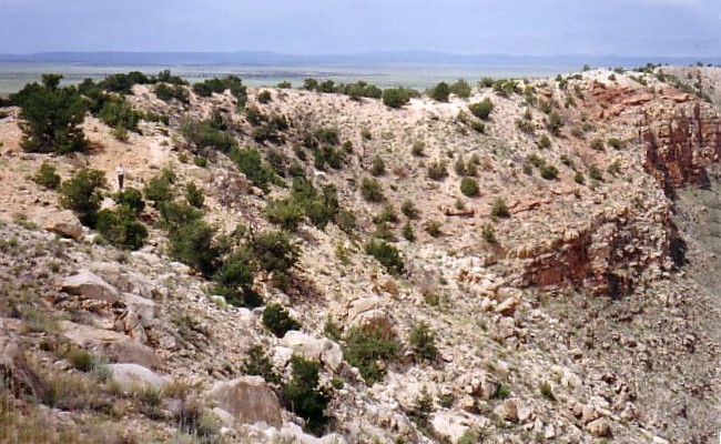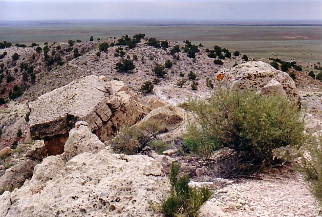 View toward southeast. 'Knob' landmark, clump of four cedars, and structures at bottom of crater.
