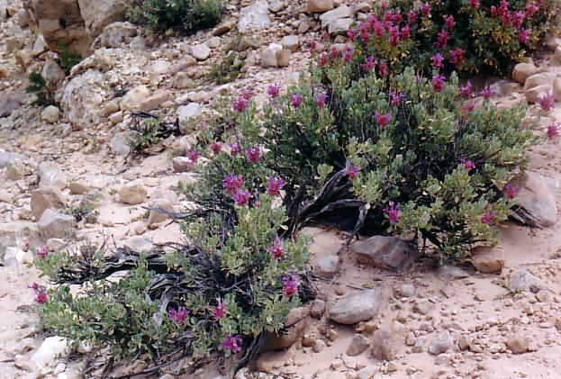 Desert plant life resembling clover. The trail curves at the left of the photo.
