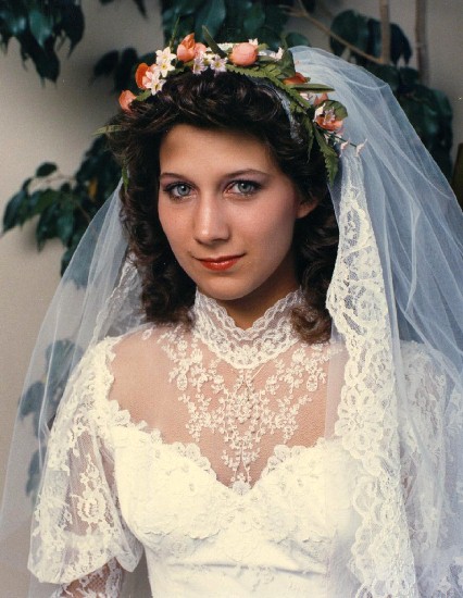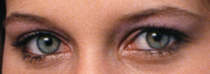 Location: A hallway in the church building. Camera: Fujica ST605N-manual focus single-lens reflex 35mm w/cloth horizontally-traveling focal plane shutter and coupled match-needle exposure metering. Lens: 55mm f/2.2 Fujinon Film: Kodak Kodacolor ASA 100. Lighting: Sunpak AP-52 Thyristor set on 'full' manual and bounced off a white umbrella reflector held over my left shoulder. Exposure Settings: 1/60 second (sync speed) at f/5.6 (probably) These digitized images were scanned from an 8x10 print. I scanned at a resolution that provided about a 3.5 meg file size for the full size and the face size images and about 2.5 megs for the eyes. They were resized to fit the page and saved in 'jpeg' format at what my software calls 90% quality. |