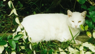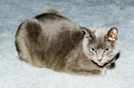 Blue got his name from the 'Blue Team' at youth church camp. Another of our sons was the team leader. Some of the girls on the team found Blue in a parking lot under a car if I remember correctly and gave him to our son. Blue's fur is almost as fine as mink and his nose, footpads, and skin are very pink, but his eyes aren't blue. The camera caught him blinking one eye. Blue died of natural causes this summer (2001) at the age of 10. |