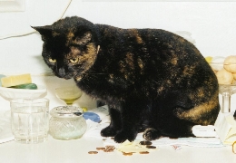 Storm is an abandoned cat that our son found in a box at the entrance to Kmart where he worked at the time. She and the two others with her didn't even have their eyes open. He fed them from doll baby bottles with our help. One was given to a lady with a nursing cat and we raised the other two, but one was run over.. Storm is a little bit eccentric, but we blame it on old age or the lack of a cat mother to train her. She was born a few years before "Desert Storm." |