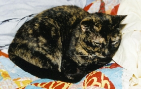 Twinka is the only cat left that was born here. Her Grandmother was Siamese. Twinka spent most of her early years huddled in the back yard. She was afraid of everything. Anytime I stopped in the yard, though, she would come try to climb into my lap. Now that the older cats are gone, Twinka gets to come inside nearly every day. Usually she runs as fast as she can to jump onto our bed. She thinks that if she pretends to be asleep we won't pick her up and take her out and she's right most of the time. |