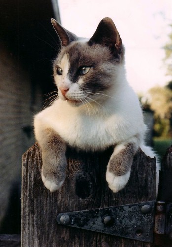 Our son John took this 'blue ribbon'-winning photo of Christine. She was the mother of Twinka and perhaps a descendent of Windy. She lived for many years after this photo was made, but she was in very poor health during her final year. Christine was often waiting here on the fence when I got home from work. |