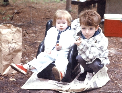 | Becky and Jimy about May of 69 during a picnic outing. We didn’t really camp, but we would often take food for picnics when we traveled. We still have the little black foam chair. It is what passed as a child's carseat in the late '60s. |