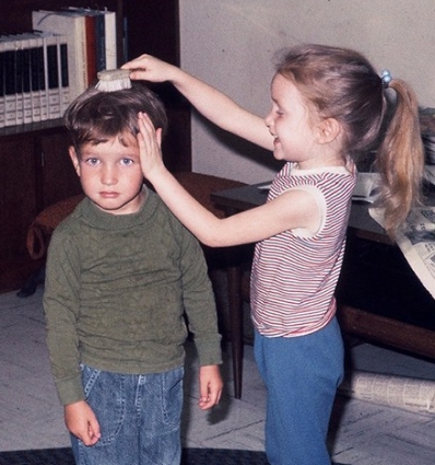 | Becky combing John’s hair. (Maybe Ann said I didn’t take many pictures of John.) He was about 4 in this photo. |