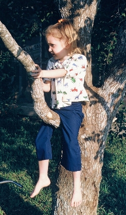 | Becky in the little tree in our front yard. These trees are scorned by the people in this area because of the messy seed husks and leaves, but they grow fast and make good shade and they’re easy for kids to climb. |