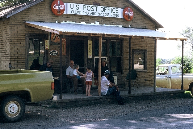| Becky and John visiting Grandpa Halbrook on the porch of his store and post office in Cleveland, Arkansas, in the summer of 1973. He is my stepfather. Thomas Williams is sitting on the porch behind the pickup and Byron Shewmake is sitting on the front of the porch. Hi Bowling, the one-armed man, is behind Byron. |