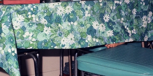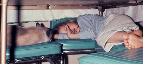 | One evening at bedtime we realized that Becky was missing. We hurridly seached the house to no avail, but then after a more careful check of the kitchen, we got a glimpse of her toes under the kitchen tablecloth. She had crawled up on the chairs and had gone to sleep with our cat, Cindy. |