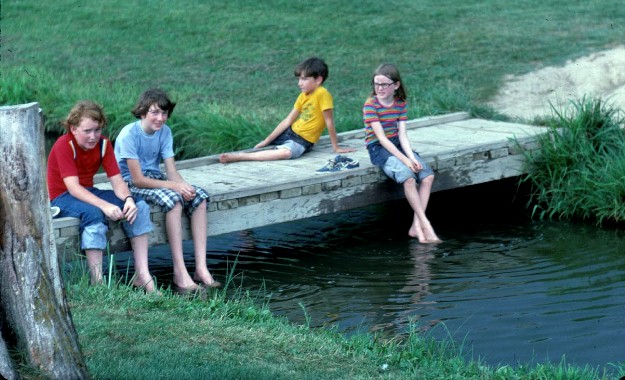 | Kids on the bridge in the city park in Springdale, Arkansas, where Ann’s parents live. This little stream is now under a pond and the library has been expanded right up to the bank of the pond. Their toes just reach the water. |