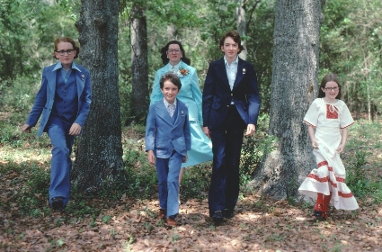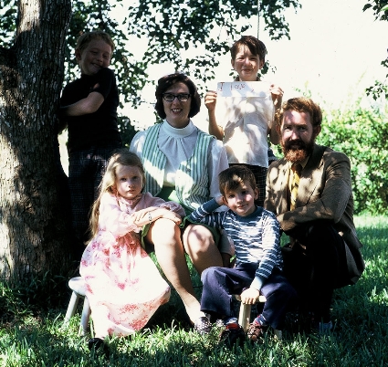| A family portrait made by the tree in our front yard in the fall of 1973. This photo illustrates the difficulty of using color slide film. It has a limited 'latitude' for exposure (especially Kodachrome) so it dosen't cover a light level of bright sun to partial shade very well. This results in contrasty pictures and a complete loss of quality if the overall exposure is very far off. The exposure here was pretty close for the partial shade, but the sky is totally burned out and the deep shadows are black. |