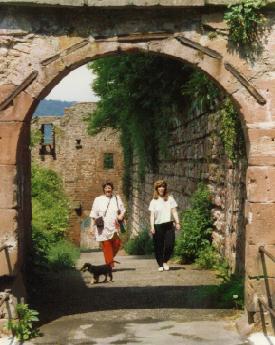 The trail connects to a walkway along the castle wall through these arches. I think that it may have been covered at one time. There were no guides or caretakers around; visitors were free to wander the castle grounds. Ann and Patty provide perspective for the arches. |
