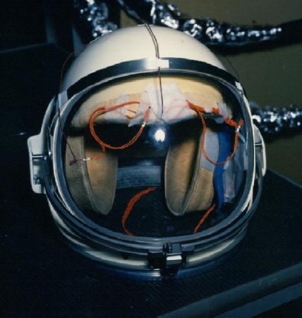 This is the instrumented test article. Thermocouple temperature sensing devices are attached the to exterior and thermistor temperature sensing devices are attached to the inner surfaces. The different devices are chosen for technical reasons. Two helmets were prepared for the test: one with a Plexiglas visor and one with the new Lexan plastic visor. Foam pads and the communications system earphones are visible inside the helmet. The visor can be rotated open. The inside of the visor was coated with a special anti-fog solution. When the visor is in place and the helmet system is pressurized, a pressurized rubber seal seals the area between the visor and helmet to eliminate leakage. The helmets also had a sun shield which could be rotated down to protect the eyes, but the sun shield wasn't needed in this test. The test was not for exposure to the sun (we weren’t ready to do that yet), but for the cold shaded areas where the sunshade might be up. |