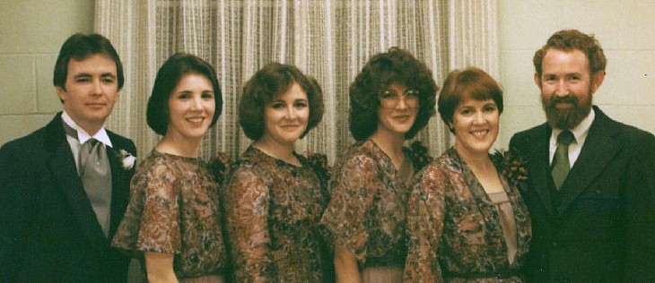 | By March 1979 we were grown? From left to right, top to bottom, I was 38; Jeanne was 37; Brenda was a little over 30; Marinelle was almost 29; John was almost 25; and Sherrye was almost 26. We were sitting on the front steps of Grandpa Maxwell's old house near Lanty. I set the exposure settings and decided on the distance; then Ann framed the shot and pushed the shutter. This photo was on Kodachrome. We also shot one on B&W film using another 35mm camera. This image was scanned from an 8x10 Cibachrome print that I made from the original slide. |