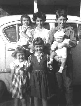 | This is probably the first photo of the six of us. I was 13; Jeanne was 12; I was holding John , who was a few months old; Jeanne was holding Sherrye, who was one year old; Marinelle was 4; and Brenda was almost 6. The photo was taken with the old Spartus Miniature. Momma probably took it. We were standing by the 1953 Plymouth Cranbrook which was parked by the front steps of the house. |
