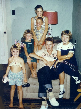 | In this photo I was 18, Jeanne was 17, Brenda was almost 11, Marinelle (at my right elbow) was 9, Sherrye was 6, and John was 5. We were in the northwest corner of our living room in Cleveland, Arkansas. Uncle Irving took this slide. |